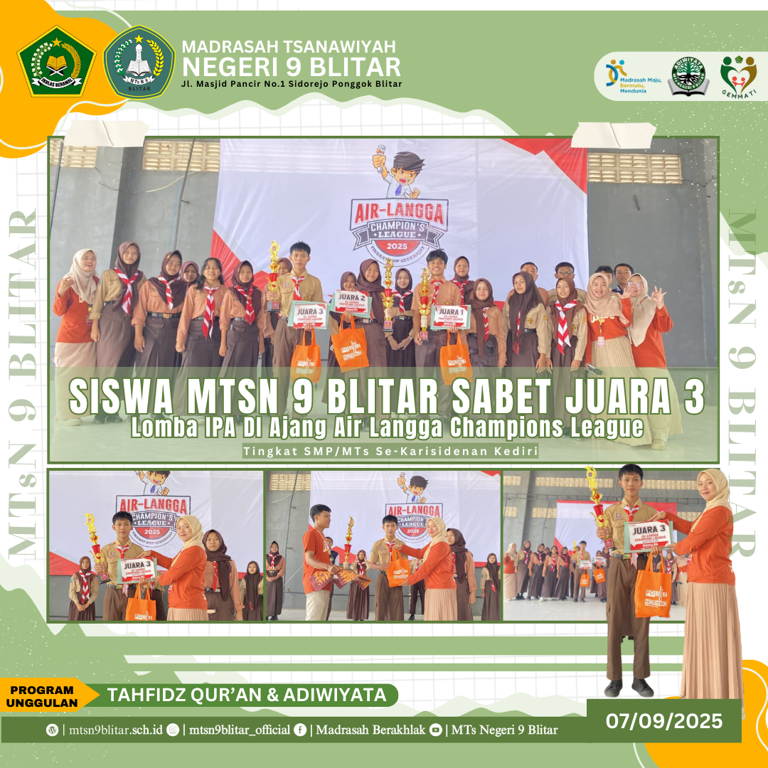Blitar, 7 September 2025 – Prestasi membanggakan kembali diraih oleh siswa MTsN 9 Blitar. Muhammad Sahrul Nizam dari kelas 9E berhasil menorehkan prestasi gemilang dengan meraih Juara 3 dalam ajang kompetisi Air Langga Champions League (ACL) 2025 di bidang IPA (Ilmu Pengetahuan Alam).