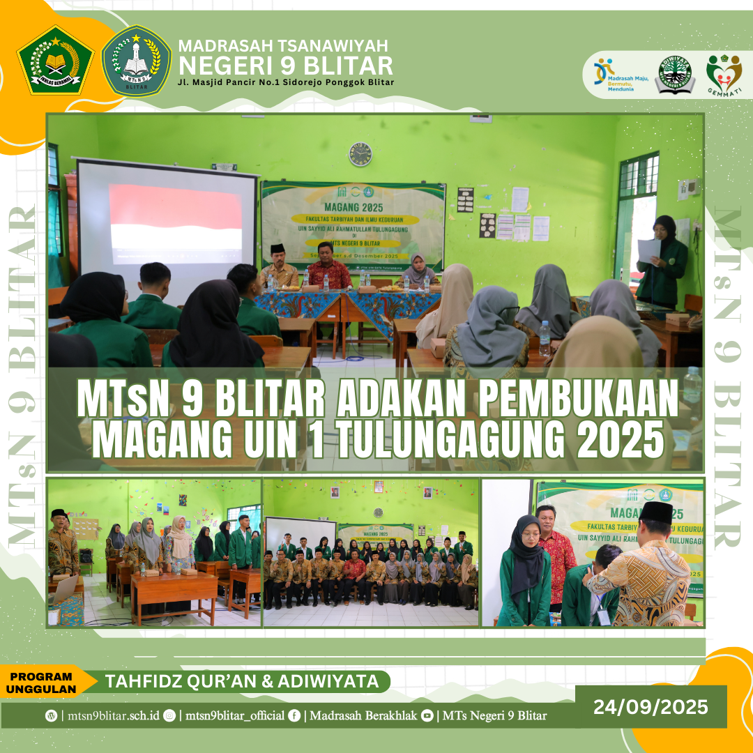 Blitar, 25 September 2025 – MTsN 9 Blitar hari ini menggelar acara pembukaan program Magang 2025 yang diikuti oleh sejumlah mahasiswa dari UIN Sayyid Ali Rahmatullah Tulungagung. Acara yang berlangsung di aula madrasah ini menjadi penanda dimulainya proses pembekalan praktik lapangan bagi para calon pendidik.