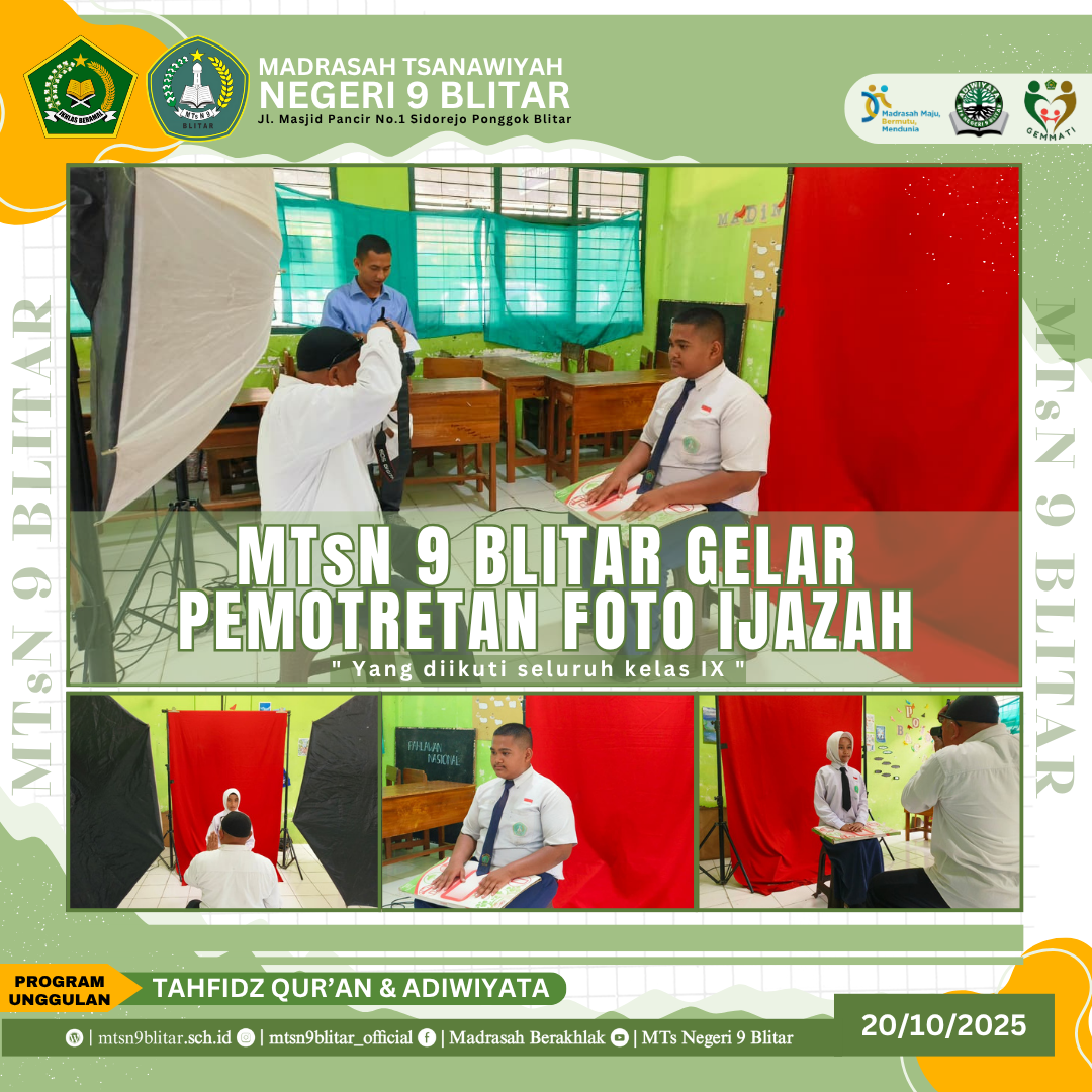 Blitar, 20 Oktober 2025 – Suasana di MTsN 9 Blitar hari ini sedikit berbeda, terlihat antrean rapi siswa-siswi yang mengenakan seragam terbaik. Madrasah hari ini melaksanakan agenda penting bagi seluruh siswa kelas IX, yaitu Pemotretan Foto Ijazah untuk tahun ajaran 2025/2026.