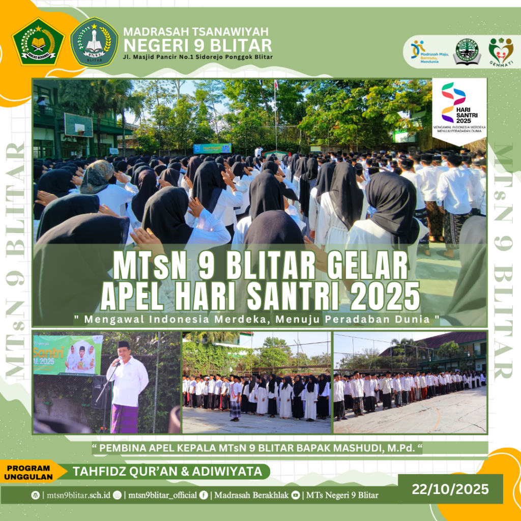 Blitar, 22 Oktober 2025 – MTsN 9 Blitar hari ini menyelenggarakan upacara bendera khusus dalam rangka memperingati Hari Santri Nasional (HSN) 2025. Apel yang digelar dengan nuansa santri yang kental ini diikuti oleh seluruh siswa, guru, dan staf madrasah.
