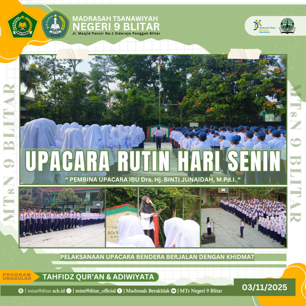 Blitar, 3 November 2025 – MTsN 9 Blitar hari ini menggelar upacara bendera rutin hari Senin dengan penuh kekhidmatan. Seluruh peserta didik, guru, dan staf madrasah berkumpul di lapangan untuk mengikuti kegiatan yang bertujuan menumbuhkan kedisiplinan dan rasa nasionalisme.