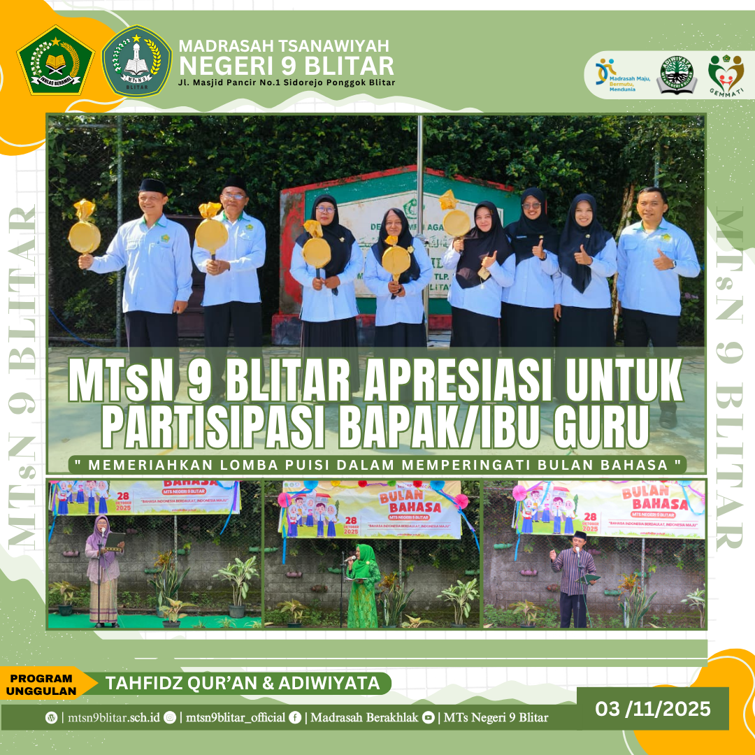 Blitar, 3 November 2025 – MTsN 9 Blitar tidak hanya mendorong siswa untuk berprestasi, tetapi juga aktif melibatkan seluruh komponen madrasah, termasuk para guru, dalam kegiatan Bulan Bahasa. Sebagai bentuk penghargaan atas partisipasi aktif, madrasah memberikan apresiasi khusus bagi Bapak/Ibu guru yang turut memeriahkan Lomba Puisi dalam rangka memperingati Bulan Bahasa 2025.