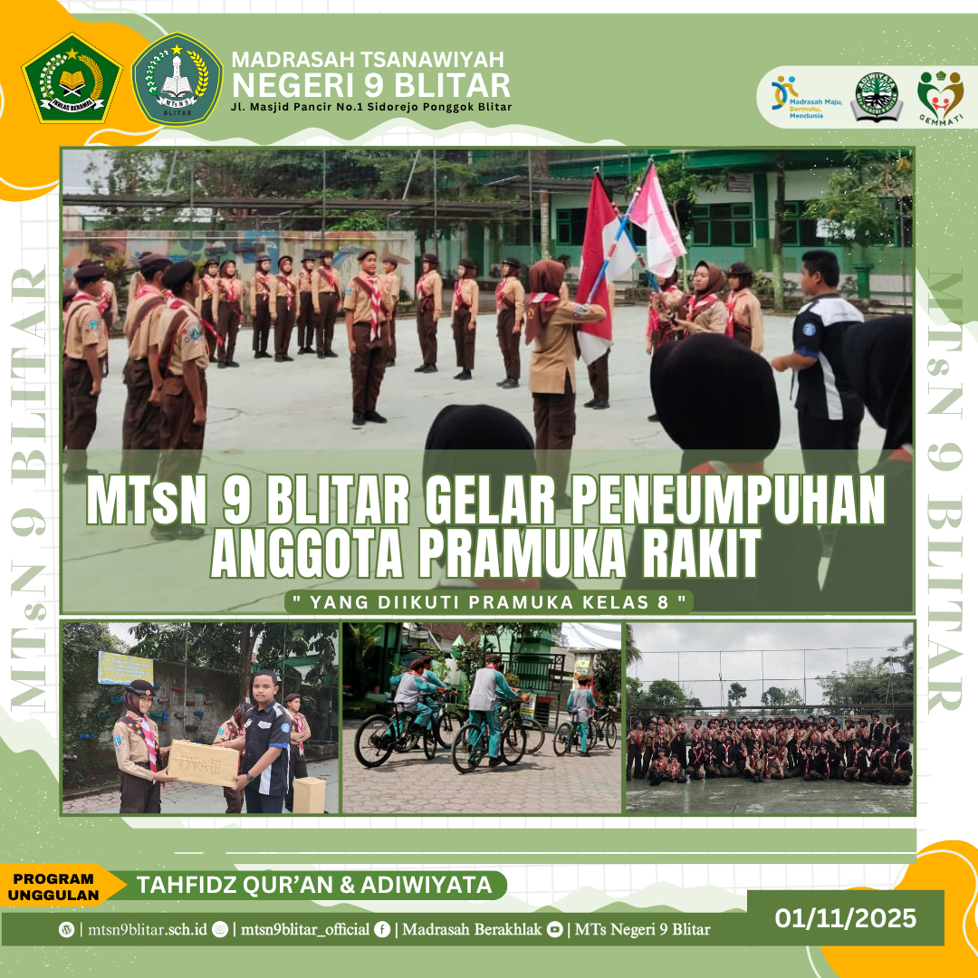 Blitar, 1 November 2025 – Gerakan Pramuka di MTsN 9 Blitar kembali menggelar kegiatan penempuhan bergengsi, yakni Penempuhan Anggota Pramuka Rakit. Kegiatan ini dilaksanakan selama dua hari penuh, dari tanggal 31 Oktober hingga 1 November 2025, dan diikuti oleh seluruh Pramuka kelas VIII.