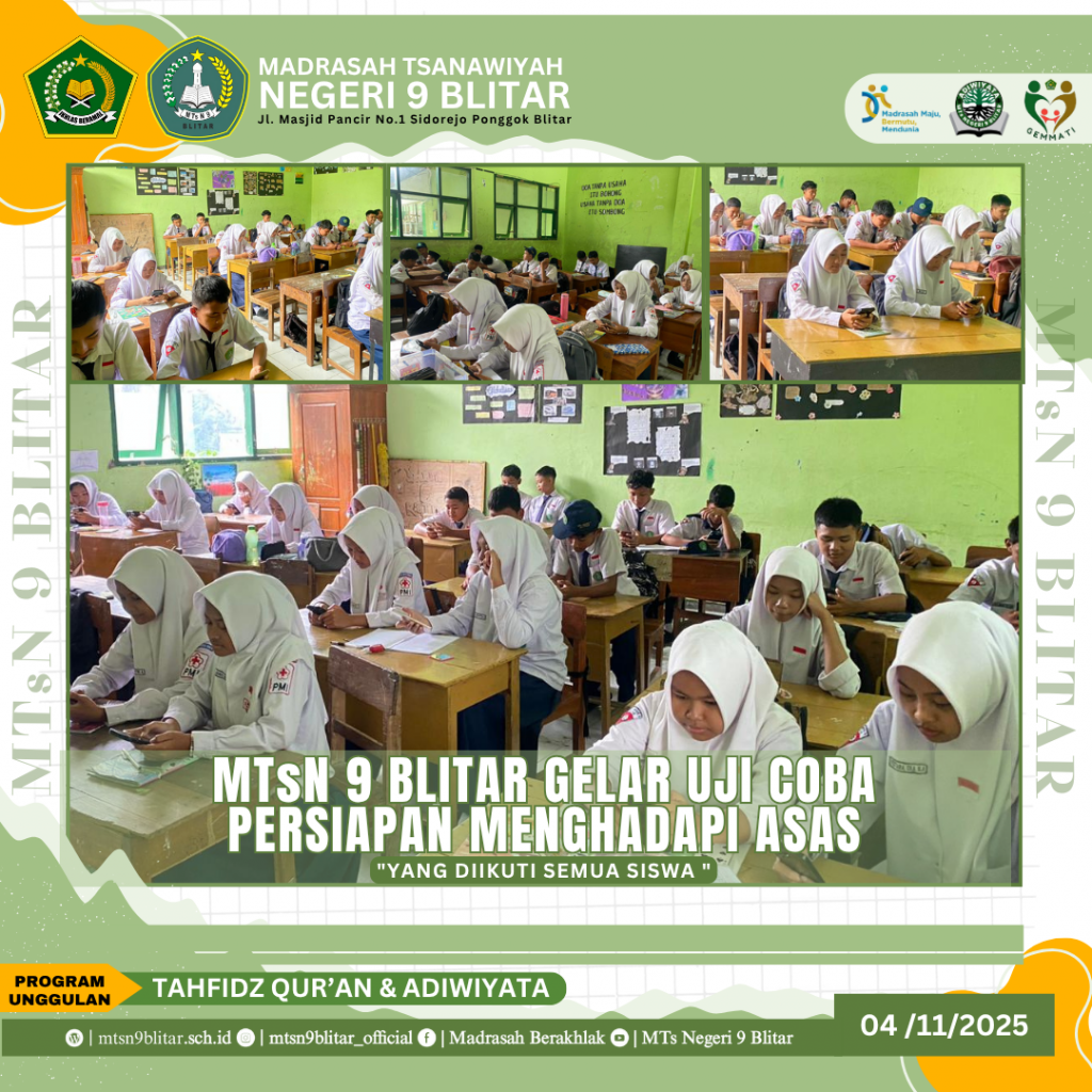 Blitar, 4 November 2025 – Dalam rangka mematangkan persiapan menjelang pelaksanaan Asesmen Sumatif Akhir Semester (ASAS) yang akan segera tiba, MTsN 9 Blitar melaksanakan Uji Coba Persiapan Menghadapi ASAS. Kegiatan ini melibatkan seluruh peserta didik dari kelas VII, VIII, dan IX.
