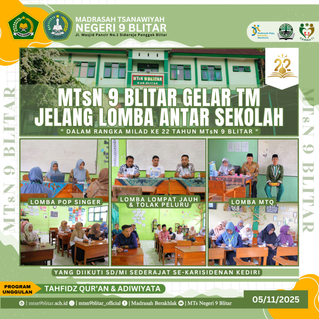 Blitar, 5 November 2025 – Dalam rangka memeriahkan Milad ke-22, MTsN 9 Blitar hari ini melaksanakan Technical Meeting (TM) untuk mempersiapkan pelaksanaan lomba bergengsi antar sekolah tingkat SD/MI sederajat se-Karesidenan. Pertemuan teknis ini dihadiri oleh perwakilan guru pendamping dan official dari berbagai sekolah peserta.