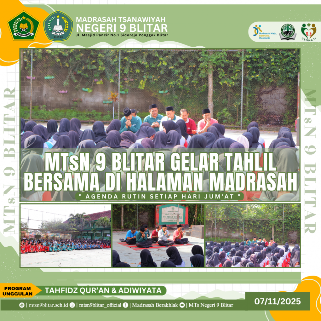 Blitar, 7 November 2025 – Seluruh keluarga besar MTsN 9 Blitar melaksanakan agenda keagamaan rutin, yaitu Tahlil Bersama yang digelar setiap hari Jumat. Kegiatan ini dilaksanakan di halaman madrasah, melibatkan seluruh siswa, guru, dan staf, menciptakan suasana khidmat dan religius di awal pekan terakhir sekolah.