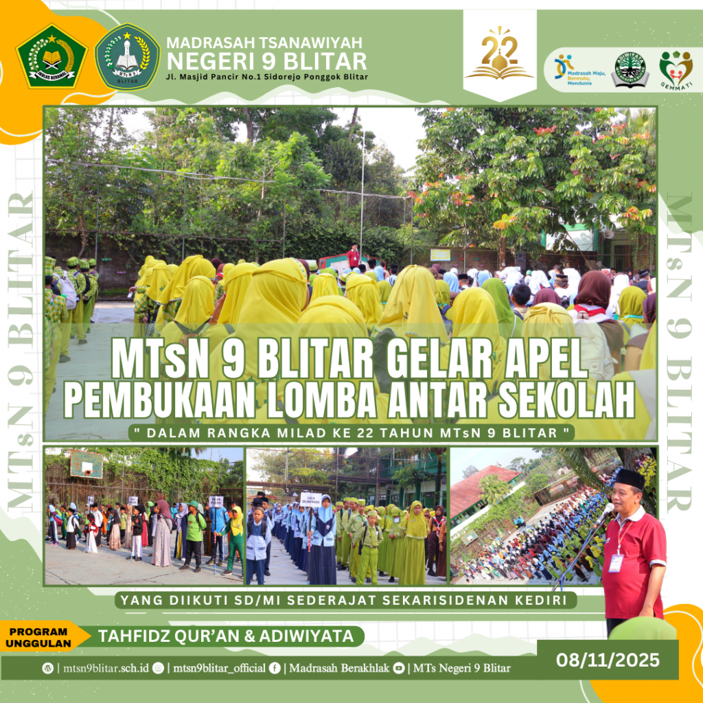 Blitar, 8 November 2025 – Dalam rangka memperingati Milad ke-22 Tahun, MTsN 9 Blitar hari ini menggelar Apel Pembukaan Lomba Antar Sekolah Tingkat SD/MI Sederajat se-Karesidenan Kediri. Acara dibuka dengan meriah di halaman madrasah, menandai dimulainya kompetisi yang diikuti oleh total 442 peserta dari berbagai sekolah.