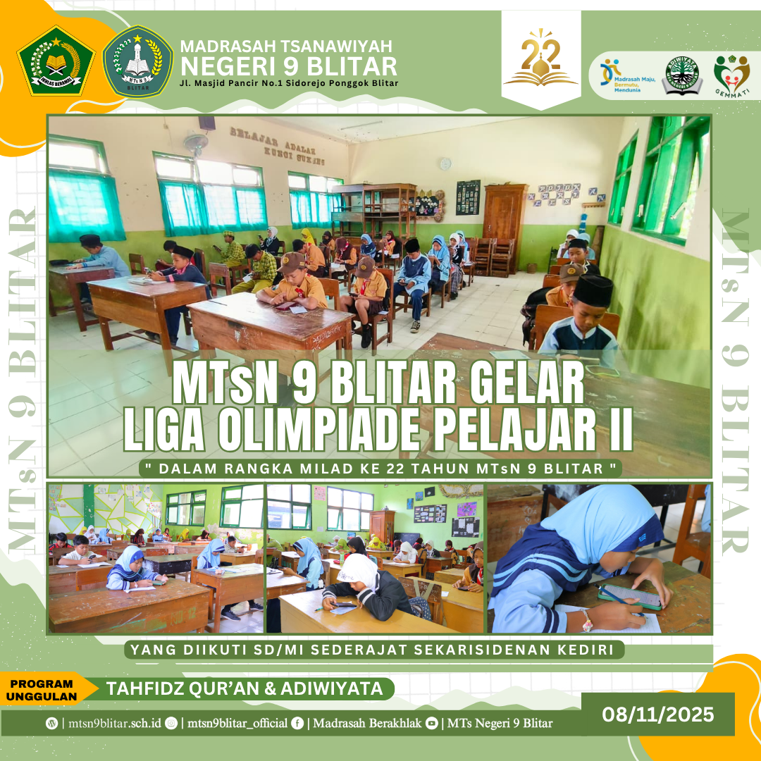 Blitar, 8 November 2025 – Sebagai puncak dari rangkaian perayaan Milad ke-22, MTsN 9 Blitar hari ini sukses menyelenggarakan Liga Olimpiade Pelajar II. Kompetisi akademik bergengsi ini diikuti oleh siswa-siswi terbaik dari tingkat SD/MI sederajat Se-Karesidenan Kediri, menunjukkan antusiasme yang luar biasa dari sekolah-sekolah di wilayah tersebut.