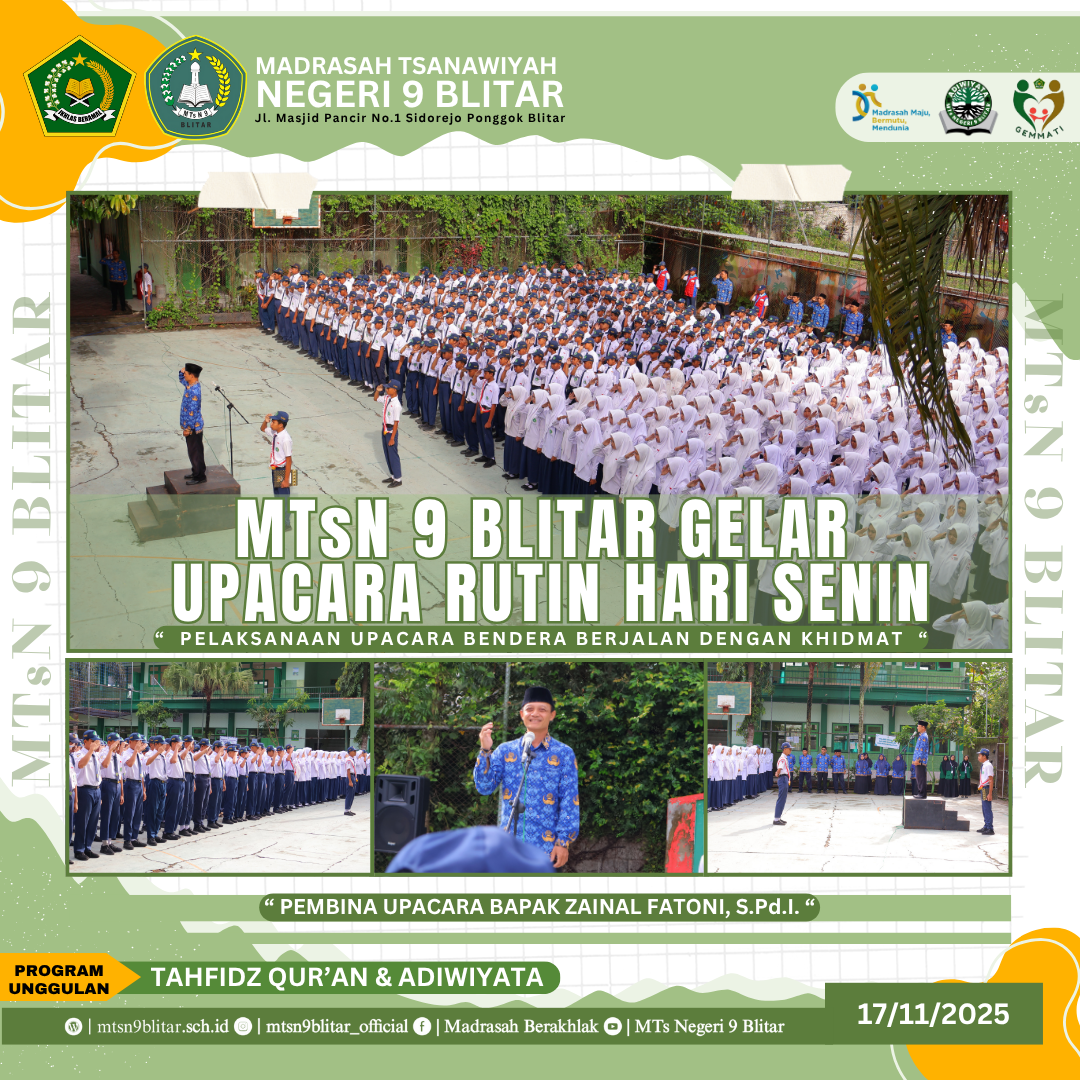 Blitar, 17 November 2025 – MTsN 9 Blitar melaksanakan upacara bendera rutin hari Senin. Upacara pagi ini diikuti oleh seluruh siswa, guru, dan staf madrasah, dan berlangsung dengan penuh kekhidmatan di halaman madrasah.