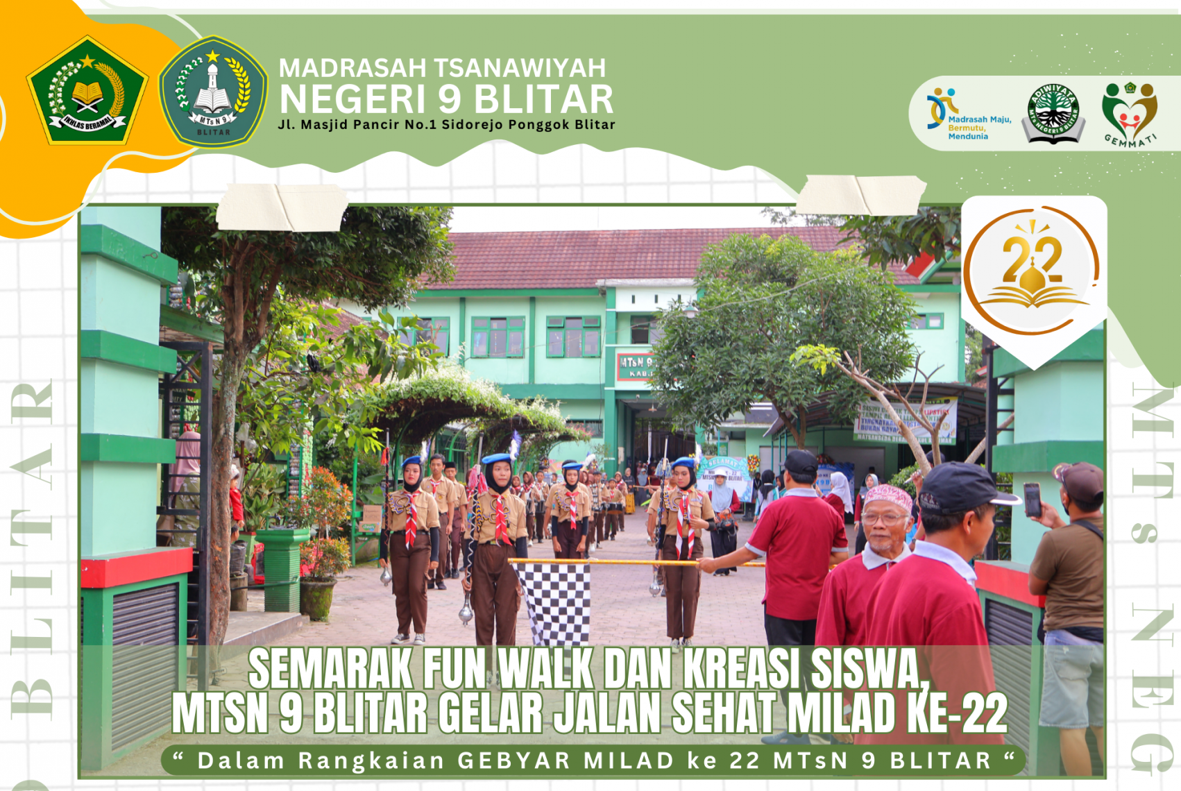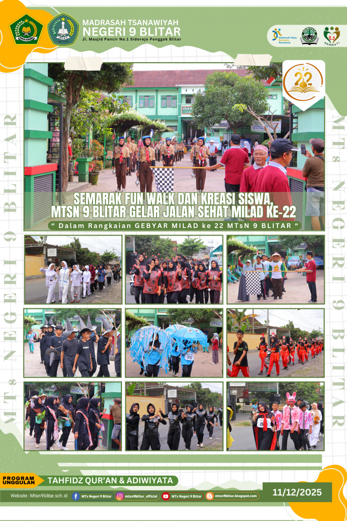 Blitar, 11 Desember 2025 – Dalam rangkaian penutup Gebyar Milad ke-22, MTsN 9 Blitar hari ini menggelar kegiatan Jalan Sehat yang penuh warna dan kegembiraan. Acara ini merupakan salah satu puncak perayaan ulang tahun madrasah yang ke-22, melibatkan seluruh siswa, guru, dan staf madrasah.