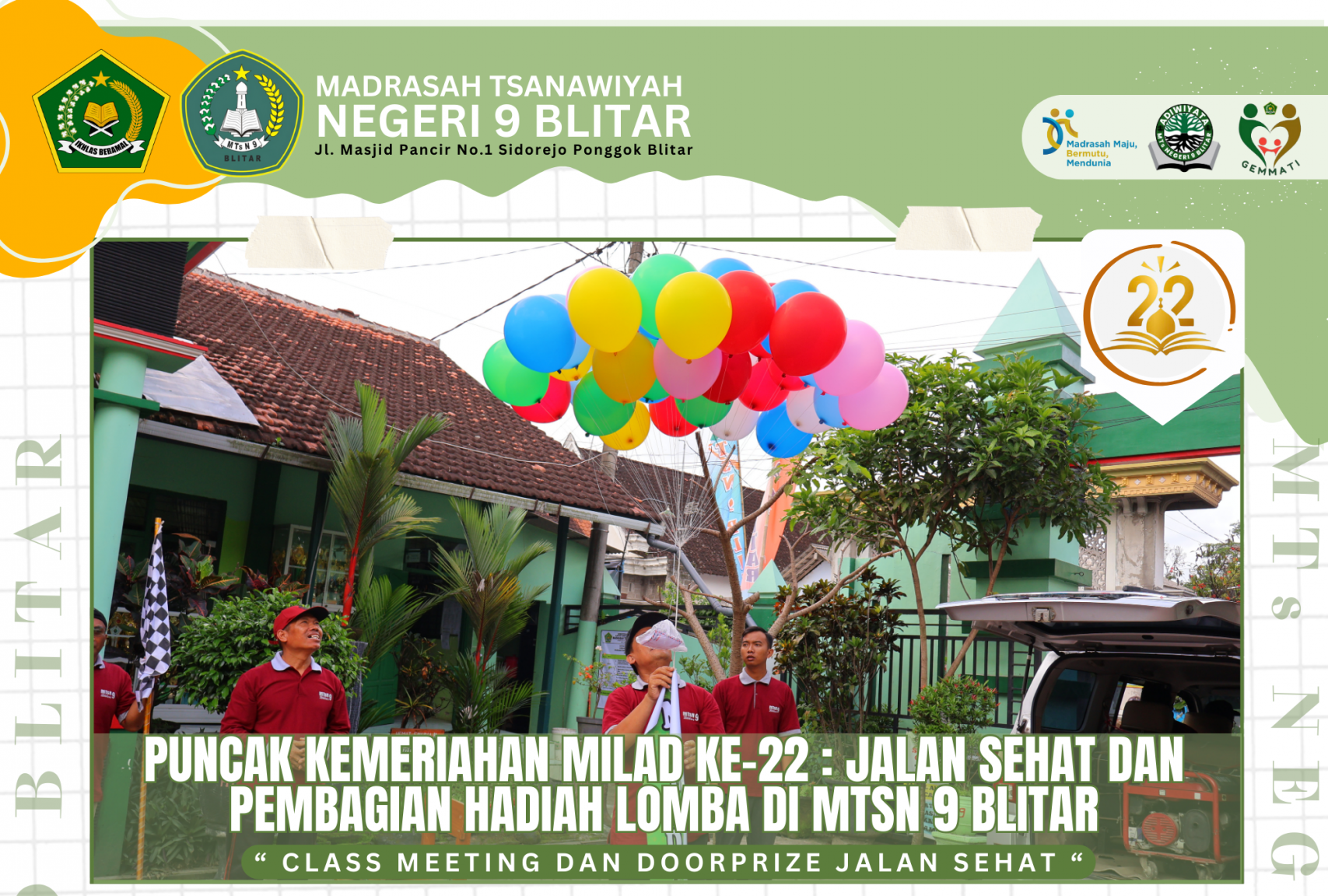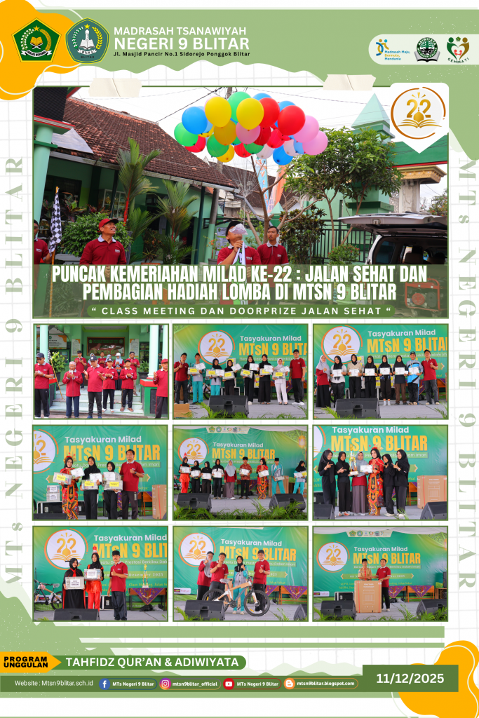 Blitar, 11 Desember 2025 – MTsN 9 Blitar hari ini menutup seluruh rangkaian Gebyar Milad ke-22 dengan acara pamungkas yang paling dinantikan, yaitu Jalan Sehat dan Pembagian Hadiah Lomba Class Meeting, yang diakhiri dengan undian doorprize fantastis.