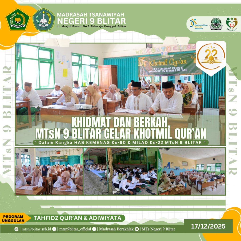 Blitar, 17 Desember 2025 – Suasana religius dan khusyuk menyelimuti MTsN 9 Blitar hari ini. Dalam rangka memperingati Milad ke-22 MTsN 9 Blitar sekaligus menyambut Hari Amal Bhakti (HAB) Kementerian Agama RI ke-80, madrasah menyelenggarakan acara Khotmil Qur’an.