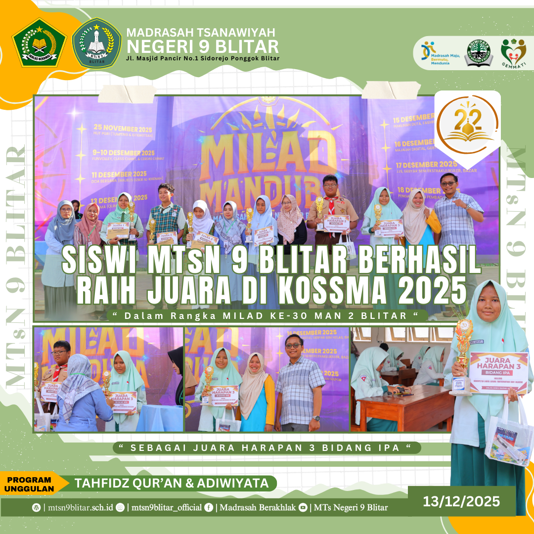 Blitar, 19 Desember 2025 – Prestasi membanggakan kembali ditorehkan oleh siswi terbaik MTsN 9 Blitar di penghujung tahun 2025. Kali ini, kabar gembira datang dari ajang bergengsi KOSSMA 2025 (Kompetisi Olimpiade Sains Sosial Matematika dan Agama), di mana perwakilan madrasah berhasil membawa pulang gelar juara.