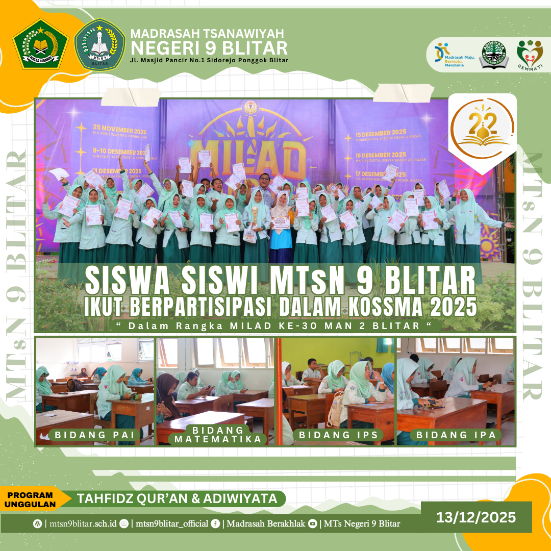 Blitar, 13 Desember 2025 – MTsN 9 Blitar turut menyemarakkan peringatan Milad ke-30 MAN 2 Blitar dengan mengirimkan delegasi siswa-siswi terbaiknya untuk berlaga dalam ajang KOSSMA 2025 (Kompetisi Olimpiade Sains Sosial Matematika dan Agama).