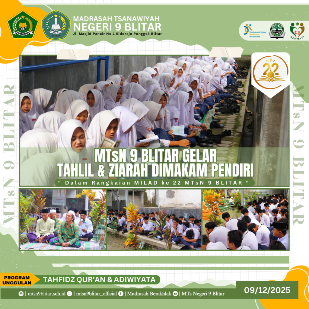 “Usia 22 tahun ini tidak lepas dari tetesan keringat dan doa para pendiri kita. Ziarah dan tahlil ini adalah cara kami menyambung sanad perjuangan dan memohon keberkahan agar MTsN 9 Blitar ke depannya semakin jaya, bermanfaat, dan mencetak generasi yang sholeh-sholehah,” tutur beliau.