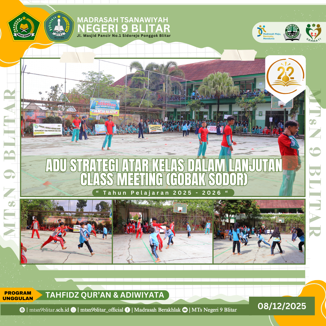 Blitar, 8 Desember 2025 – Suasana di lapangan utama MTsN 9 Blitar mendadak riuh dengan sorak-sorai pendukung antar kelas. Hari ini, rangkaian Class Meeting Tahun Pelajaran 2025/2026 memasuki salah satu cabang lomba yang paling dinantikan dan penuh gengsi, yaitu permainan tradisional Gobak Sodor.