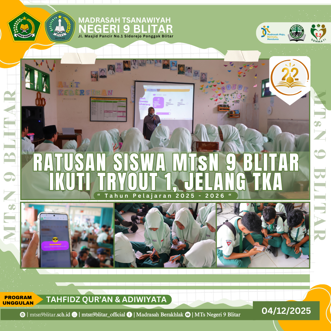 Blitar, 4 Desember 2025 – Ratusan siswa kelas IX MTsN 9 Blitar hari ini tampak serius memenuhi ruang-ruang kelas untuk mengikuti Tryout 1. Kegiatan ini dilaksanakan sebagai langkah awal simulasi dan persiapan matang menjelang Tes Kompetensi Akademik (TKA) Tahun Pelajaran 2025/2026.