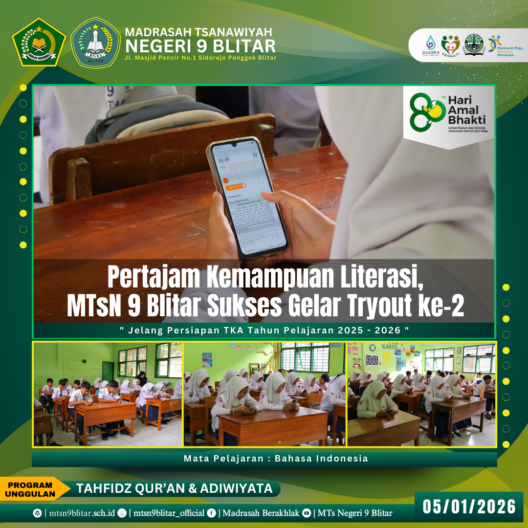 Blitar, 5 Januari 2026 – Melanjutkan rangkaian persiapan menuju Tes Kompetensi Akademik (TKA) Tahun Pelajaran 2025/2026, MTsN 9 Blitar hari ini sukses menyelenggarakan Tryout ke-2. Fokus utama pada agenda kali ini adalah pendalaman materi untuk mata pelajaran Bahasa Indonesia.
