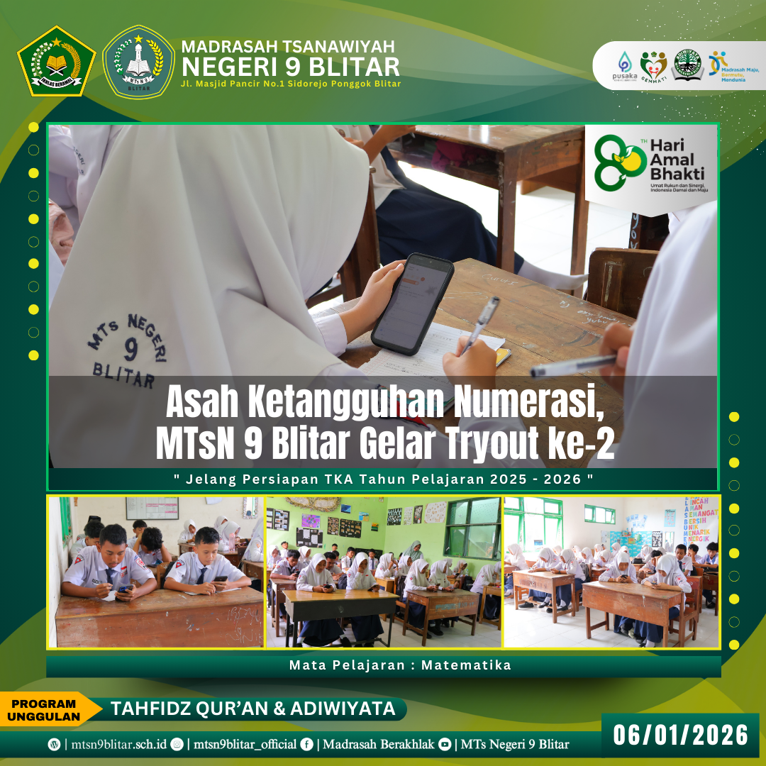 Dengan terlaksananya Tryout ke-2 Mapel Matematika ini, MTsN 9 Blitar terus berkomitmen mendampingi para siswa untuk meraih nilai akademik yang maksimal dan kompetitif.