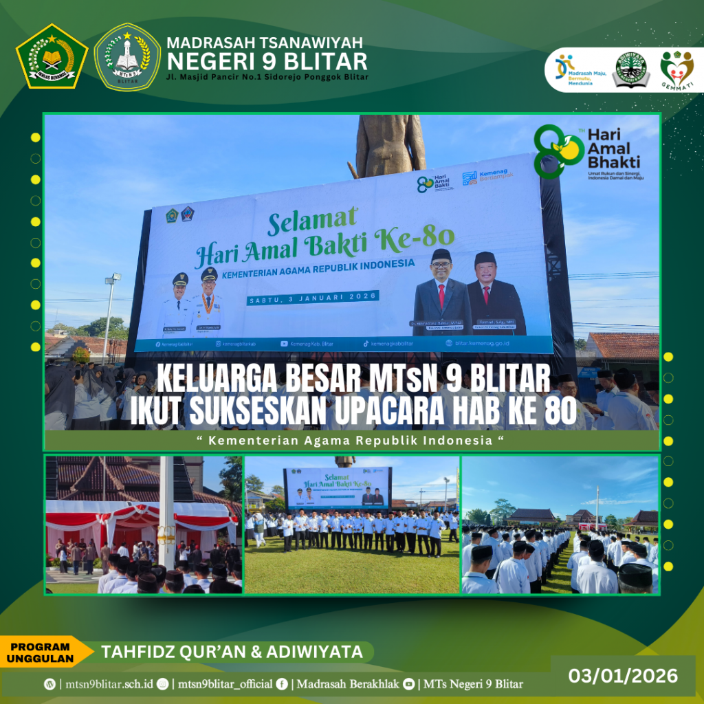 Blitar, 3 Januari 2026 – Puncak peringatan Hari Amal Bakti (HAB) Kementerian Agama Republik Indonesia ke-80 berlangsung dengan penuh khidmat dan kemeriahan. Keluarga besar MTsN 9 Blitar turut hadir dan berpartisipasi aktif dalam upacara bendera yang digelar serentak sebagai bentuk penghormatan atas sejarah panjang pengabdian kementerian dalam menjaga kerukunan umat beragama.