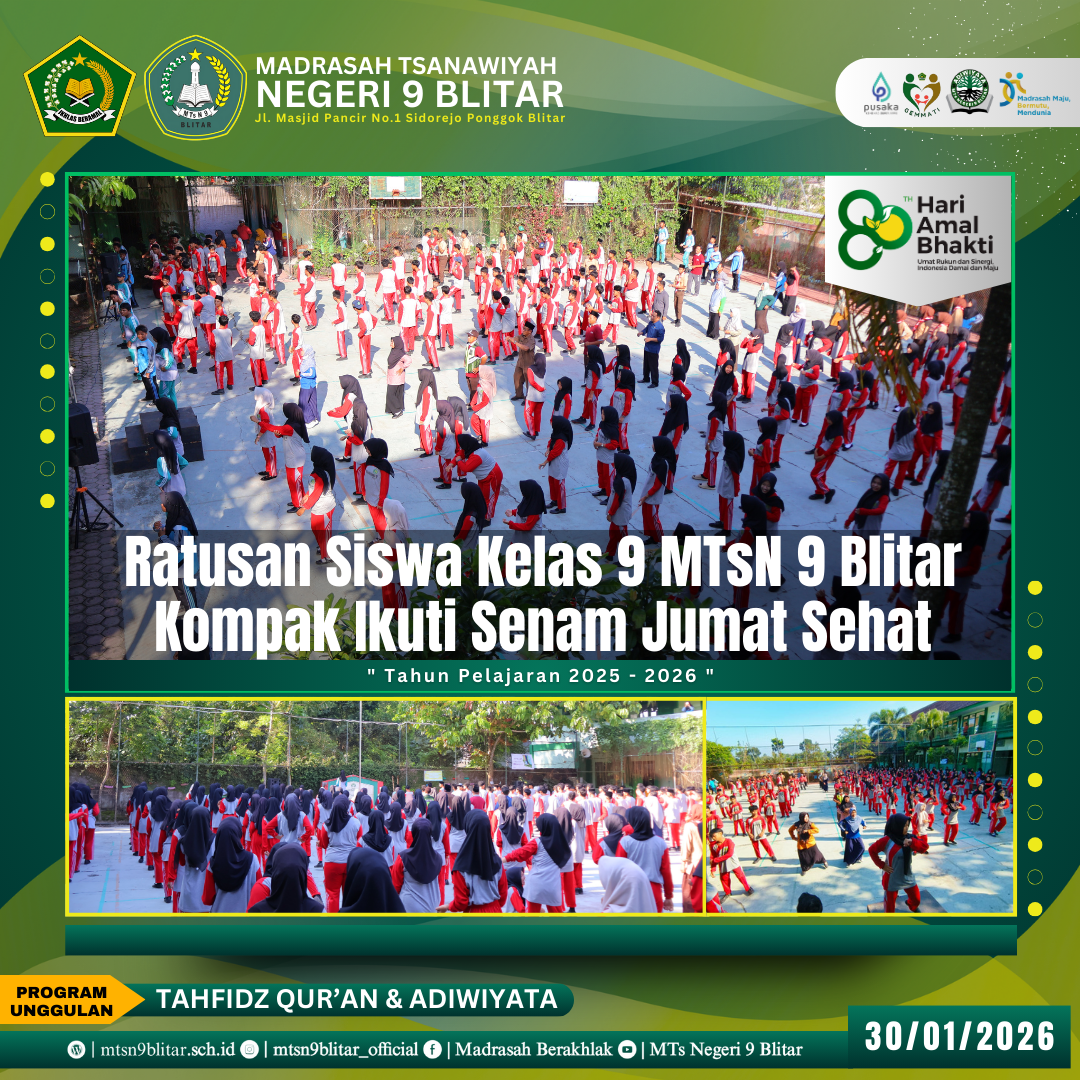 Blitar, 30 Januari 2026 – Di tengah padatnya jadwal persiapan Tes Kompetensi Akademik (TKA) dan serangkaian Tryout, siswa kelas 9 MTsN 9 Blitar mendapatkan penyegaran khusus pagi ini. Madrasah menggelar kegiatan Senam Jumat Sehat yang dikhususkan bagi para pejuang kelulusan tersebut guna menjaga kebugaran fisik dan kesehatan mental mereka.