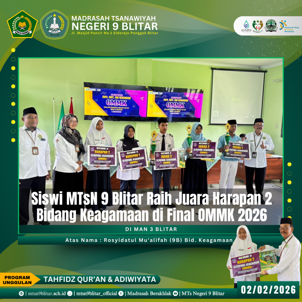 Blitar, 2 Februari 2026 – Prestasi membanggakan kembali lahir dari tangan dingin pendidik MTsN 9 Blitar. Setelah melalui persaingan ketat di babak penyisihan, salah satu siswi terbaik madrasah akhirnya berhasil menembus babak final dan meraih penghargaan pada ajang OMMK 2026 (Olimpiade Madrasah, Matematika, dan Kompetisi) yang diselenggarakan di MAN 3 Blitar.
