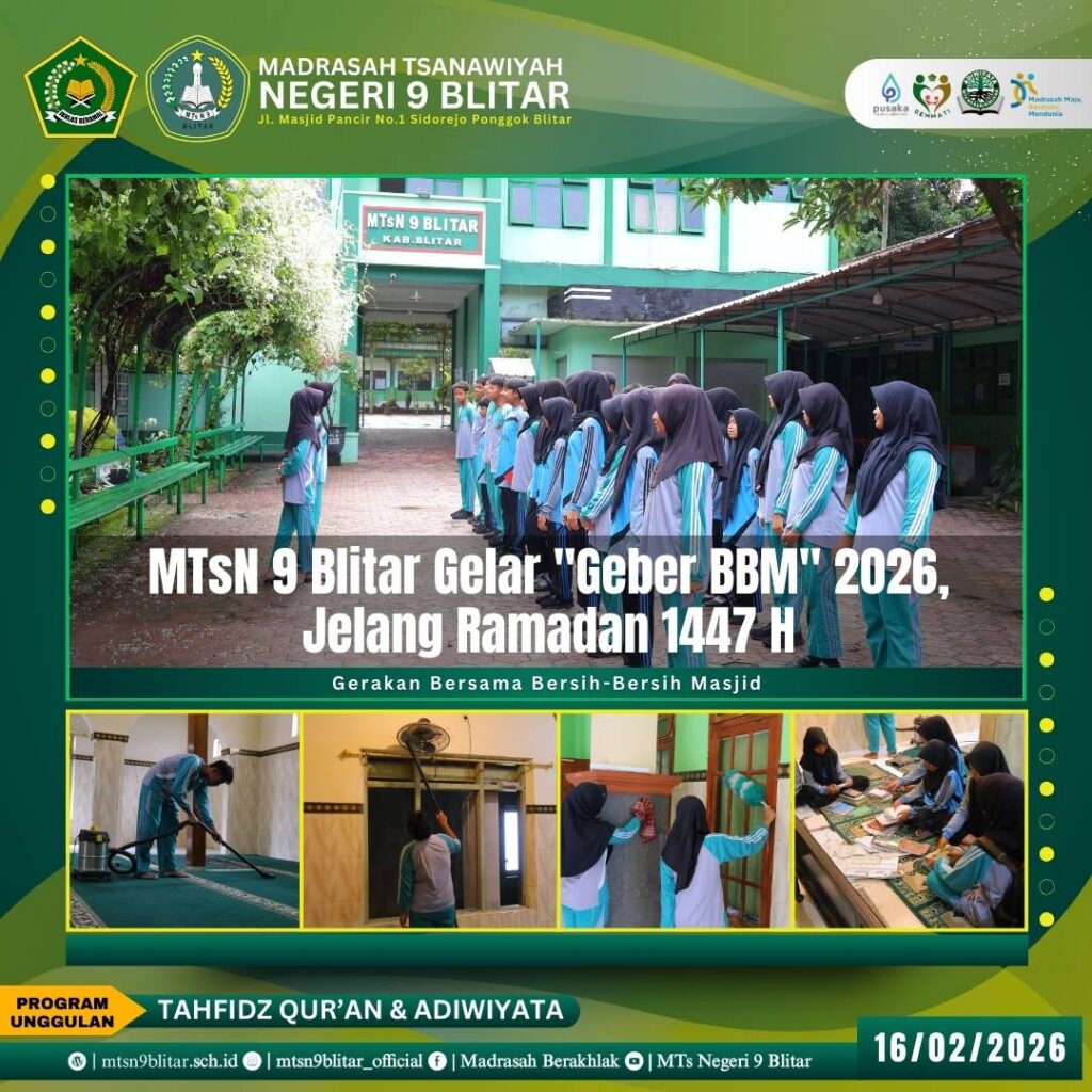 Blitar, 16 Februari 2026 – Melanjutkan rangkaian agenda menyambut bulan suci Ramadan 1447 H, MTsN 9 Blitar kembali melakukan gebrakan sosial yang inspiratif. Hari ini, seluruh civitas akademika madrasah terjun langsung dalam kegiatan Gerakan Bersama (Geber) Bersih-Bersih Masjid (BBM) 2026.