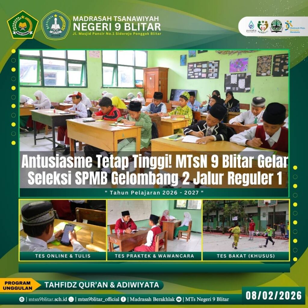 Hasil seleksi Gelombang 2 ini direncanakan akan diumumkan melalui papan informasi madrasah dan media sosial resmi dalam waktu dekat. Dengan terlaksananya agenda ini, MTsN 9 Blitar selangkah lebih dekat dalam membentuk formasi generasi emas untuk tahun pelajaran mendatang.