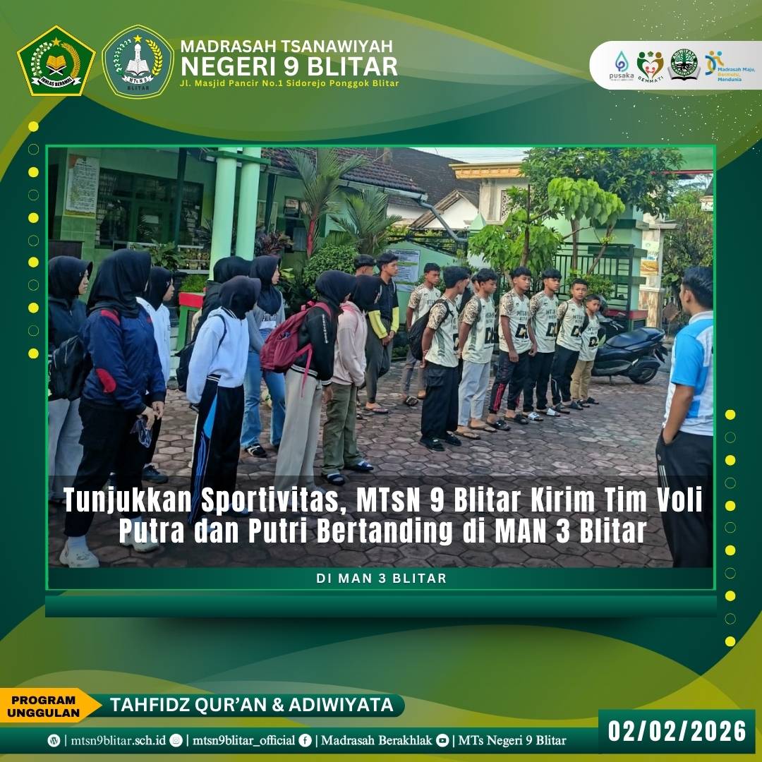 Blitar, 2 Februari 2026 – Semangat membara tidak hanya ditunjukkan siswa MTsN 9 Blitar di bidang akademik, tetapi juga di lapangan olahraga. Hari ini, madrasah resmi mengirimkan delegasi atlet terbaiknya untuk berlaga dalam turnamen bola voli yang diselenggarakan di MAN 3 Blitar.