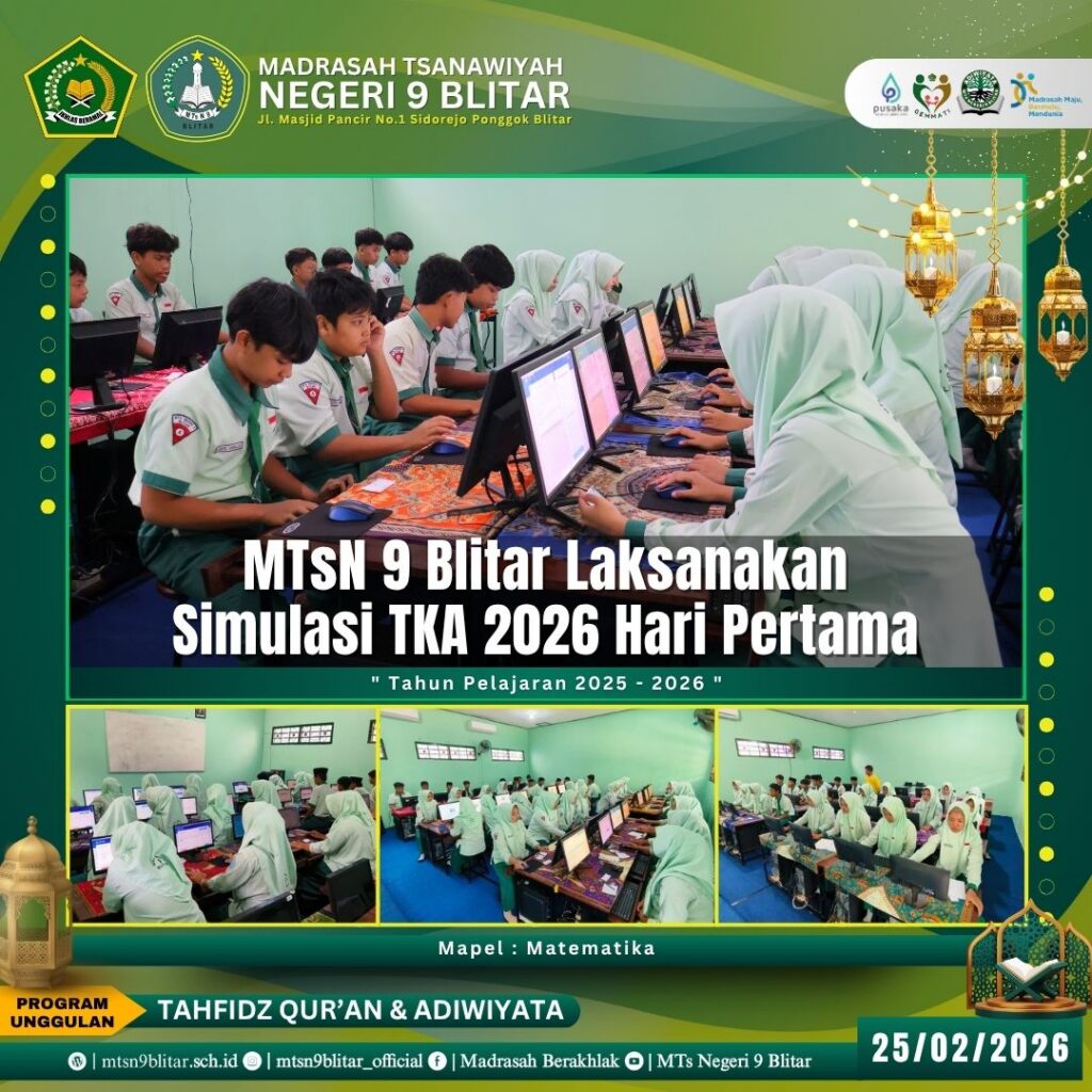 Blitar, 25 Februari 2026 – Langkah menuju gerbang kelulusan semakin nyata bagi siswa kelas 9 MTsN 9 Blitar. Mulai hari ini, Rabu (25/02), sebanyak 224 siswa mengikuti agenda Simulasi Tes Kompetensi Akademik (TKA). Kegiatan yang dijadwalkan berlangsung selama dua hari, yakni 25-26 Februari 2026, ini menjadi ajang “pemanasan” penting sebelum menghadapi ujian yang sesungguhnya.