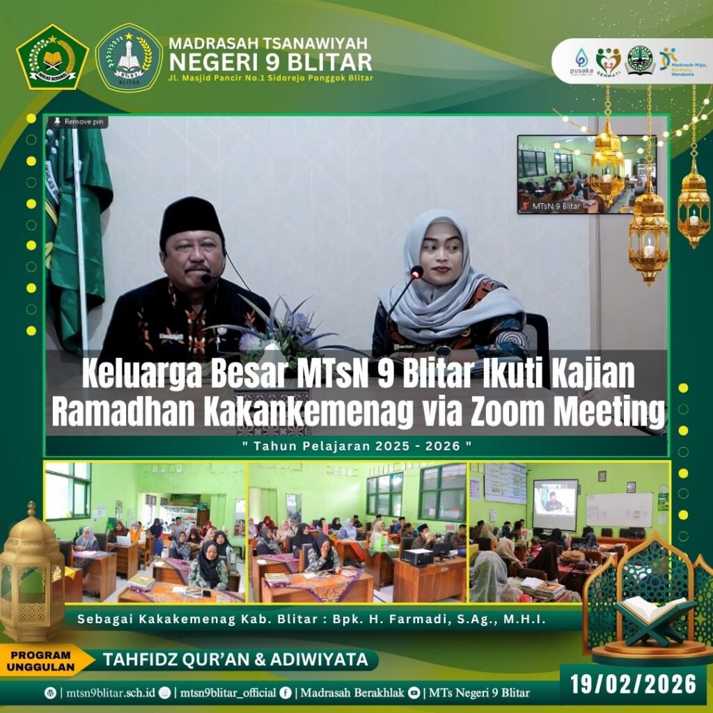 Blitar, 19 Februari 2026 – Mengawali hari pertama bulan suci Ramadan dengan “asupan” rohani yang bergizi, keluarga besar MTsN 9 Blitar turut berpartisipasi dalam agenda Kajian Ramadan yang diselenggarakan oleh Kantor Kementerian Agama (Kankemenag) Kabupaten Blitar. Kegiatan ini diikuti secara virtual melalui platform Zoom Meeting langsung dari Ruang Guru MTsN 9 Blitar.