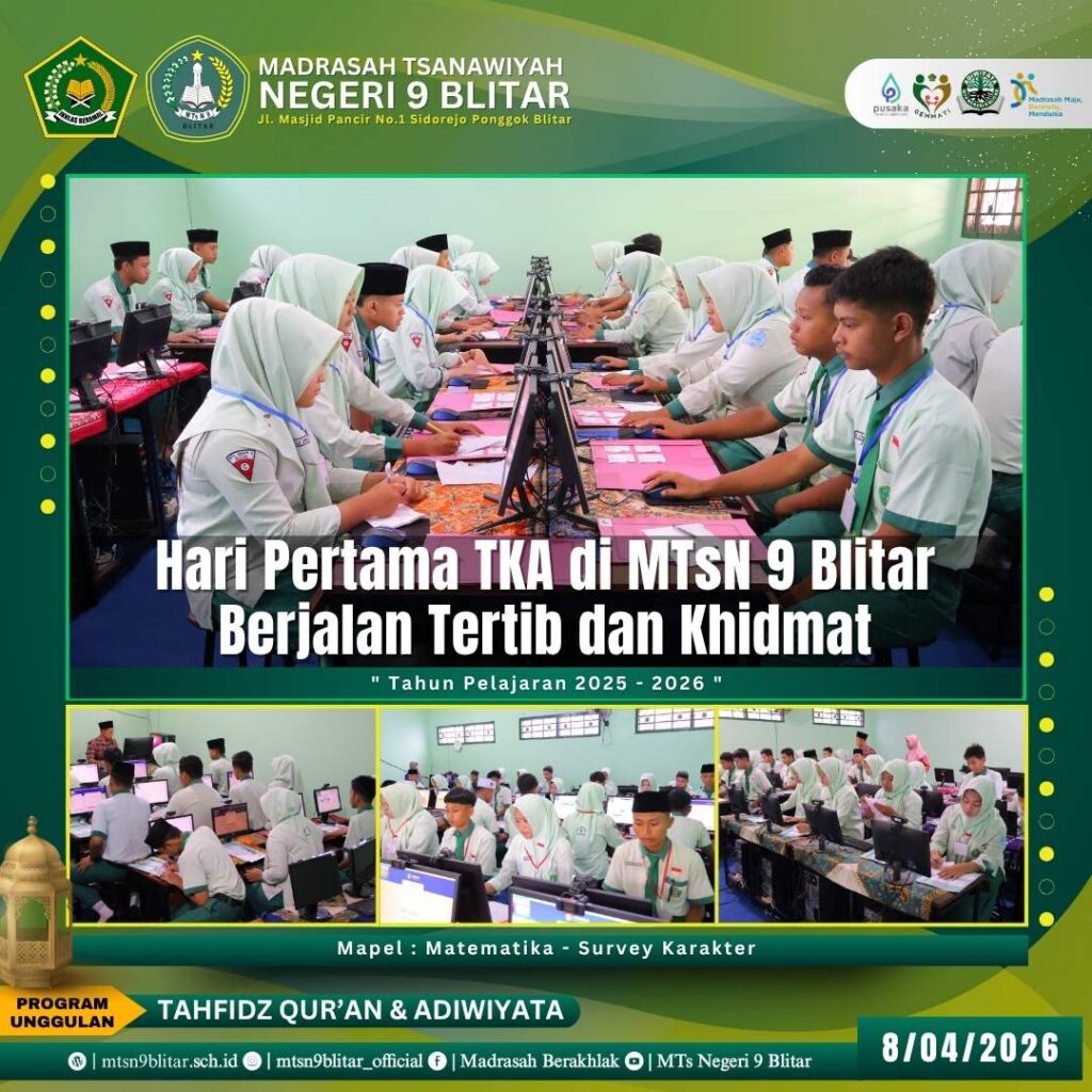 Blitar, 8 April 2026 – Suasana khidmat menyelimuti laboratorium komputer MTsN 9 Blitar pagi ini. Sebanyak 224 siswa kelas 9 mulai menempuh Tes Kemampuan Akademik (TKA) Gelombang 2. Pelaksanaan hari pertama yang jatuh pada Rabu (08/04) ini berjalan dengan sangat tertib, menjadi tonggak penting bagi para siswa dalam mengukur capaian belajar mereka selama tiga tahun terakhir.