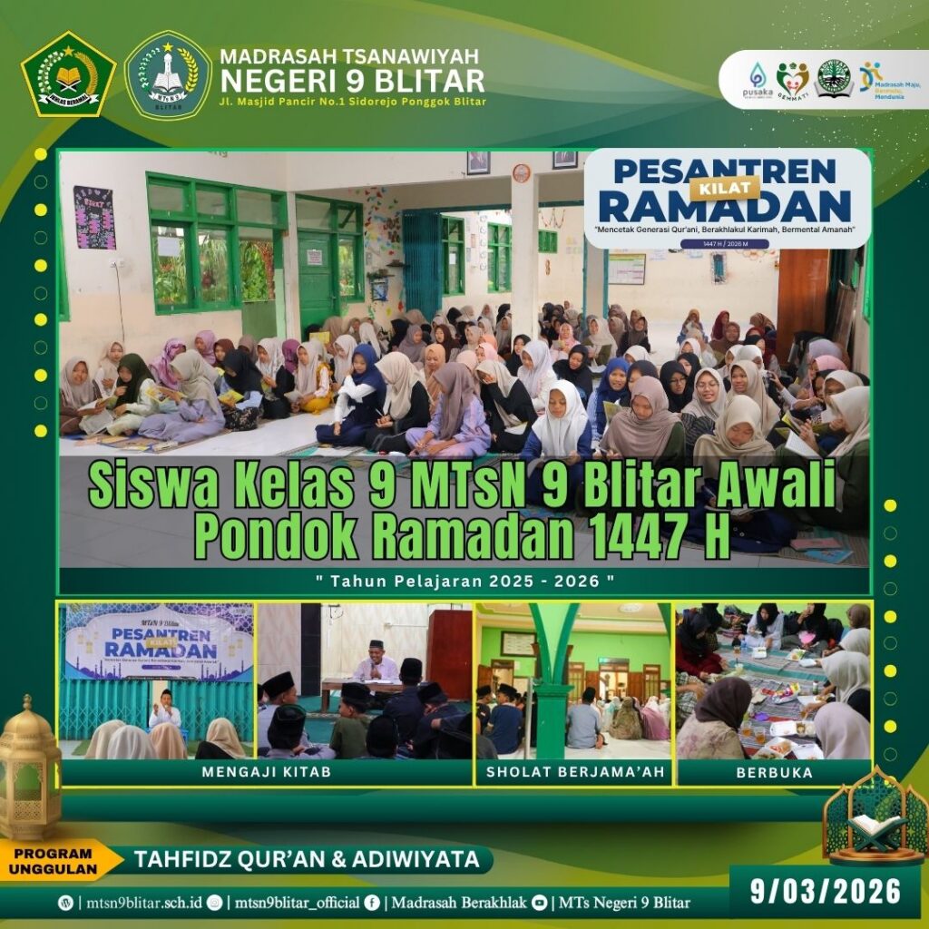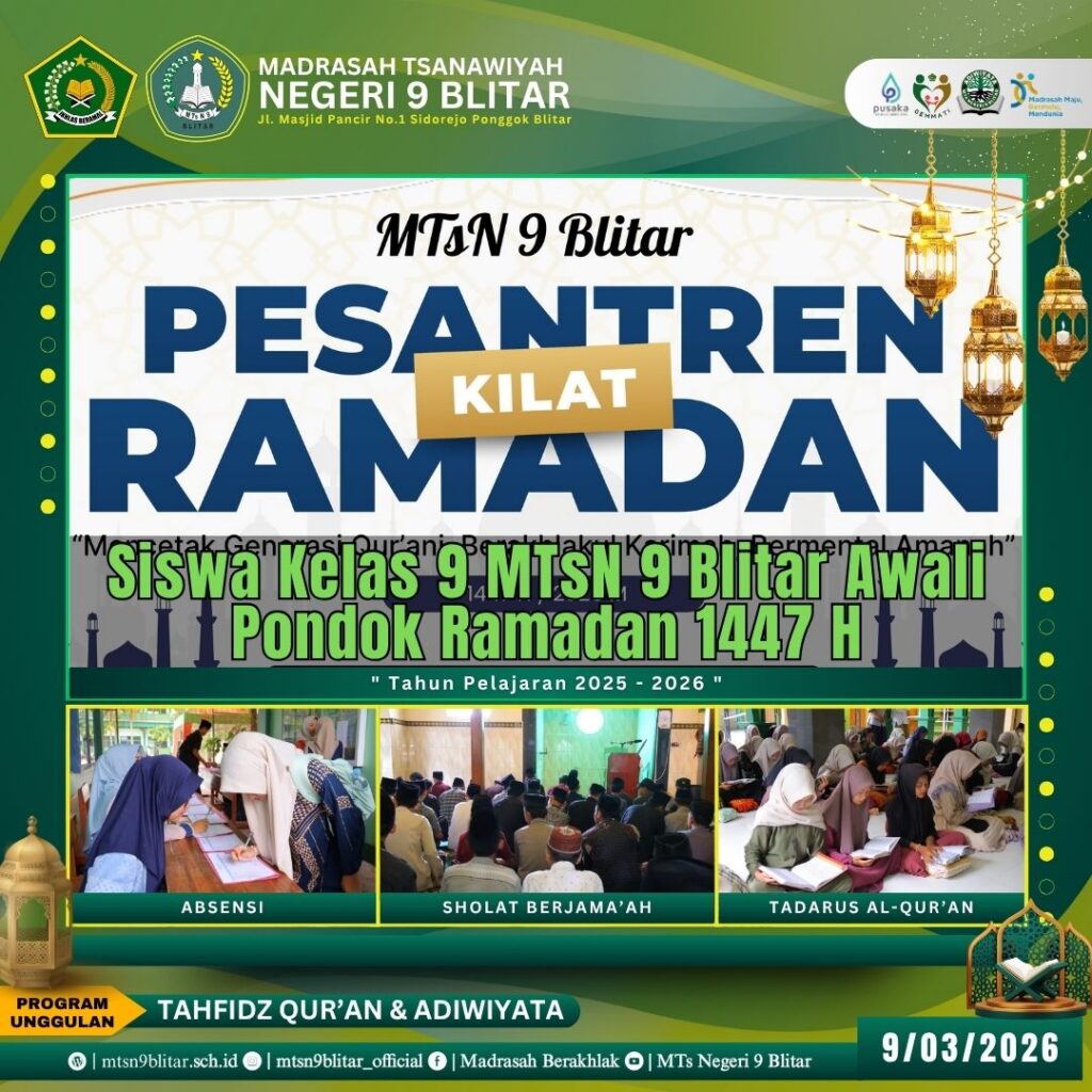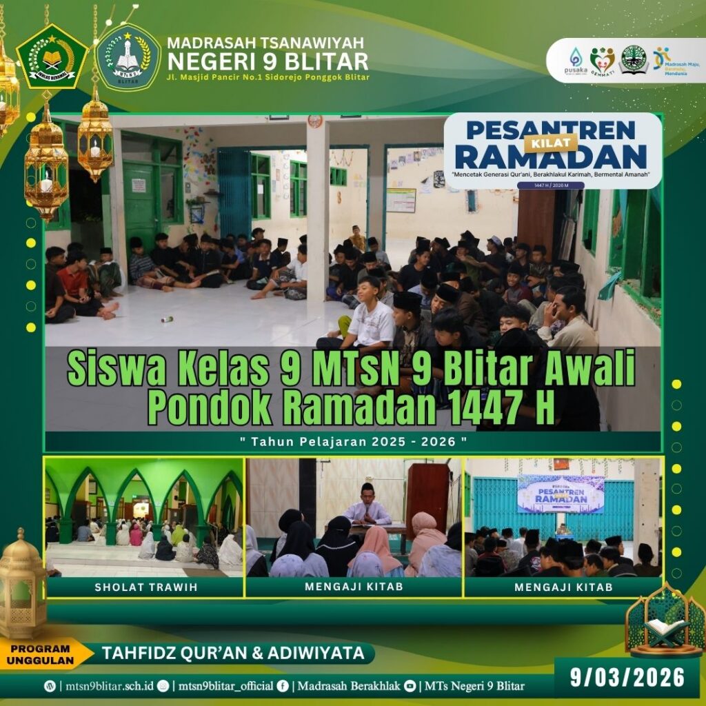 Blitar, 9 Maret 2026 – Suasana religius menyelimuti kampus MTsN 9 Blitar mulai hari ini. Madrasah resmi membuka rangkaian kegiatan Pondok Ramadan 1447 H, sebuah agenda tahunan yang dirancang untuk memperdalam pemahaman agama sekaligus memperkuat karakter siswa di bulan suci.