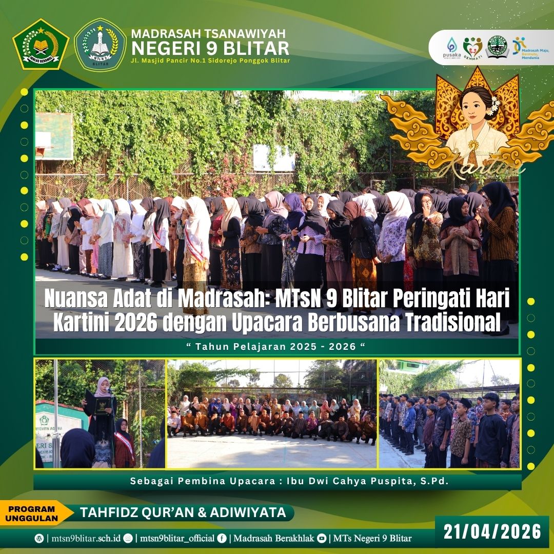 Setelah upacara selesai, kegiatan dilanjutkan dengan sesi foto bersama dan berbagai kegiatan internal kelas untuk mempererat kebersamaan. Kemeriahan warna-warni busana tradisional di lapangan MTsN 9 Blitar hari ini menjadi simbol bahwa semangat kesetaraan dan pendidikan yang diperjuangkan Kartini tetap abadi dan tumbuh subur di lingkungan madrasah.