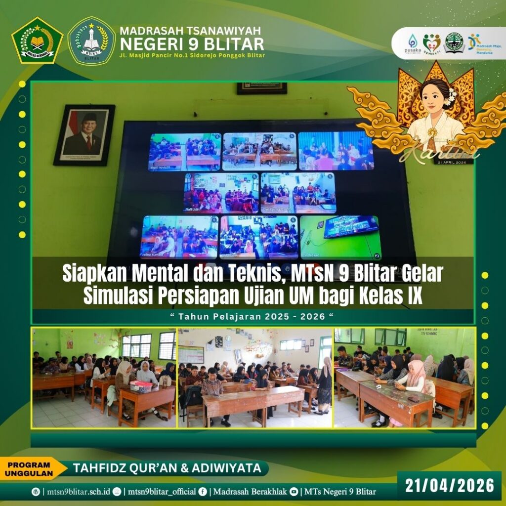 Blitar, 21 April 2026 – Guna mematangkan kesiapan siswa menghadapi akhir jenjang pendidikan, MTsN 9 Blitar menyelenggarakan Simulasi Persiapan Ujian Madrasah (UM) khusus bagi seluruh siswa kelas IX. Kegiatan ini dirancang untuk memberikan gambaran nyata mengenai mekanisme ujian sekaligus mengukur sejauh mana kesiapan akademik siswa sebelum menghadapi pelaksanaan ujian yang sesungguhnya.